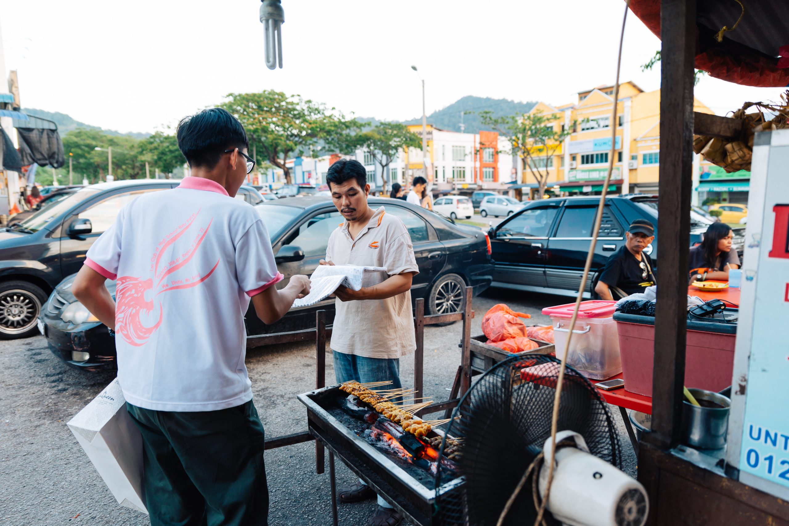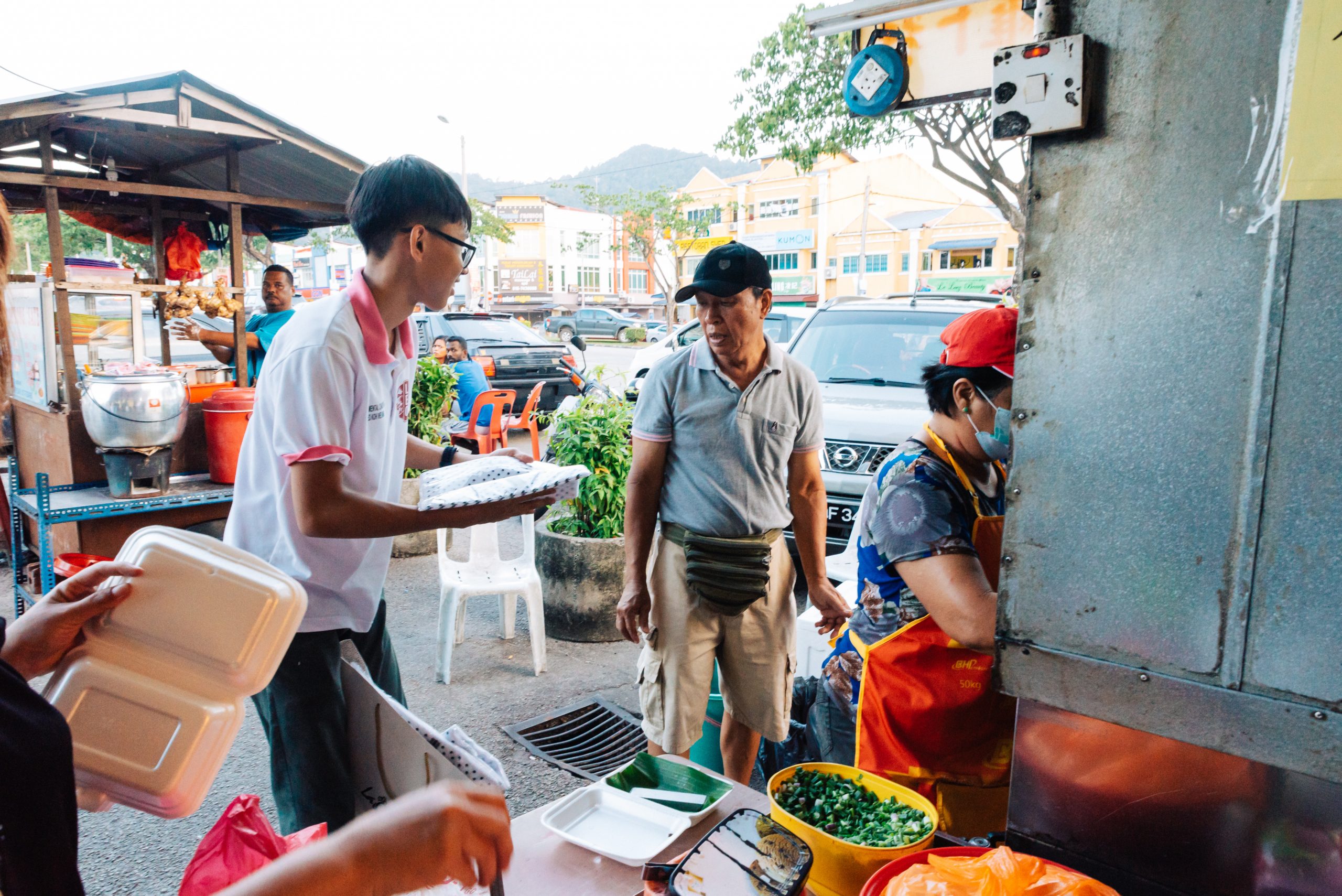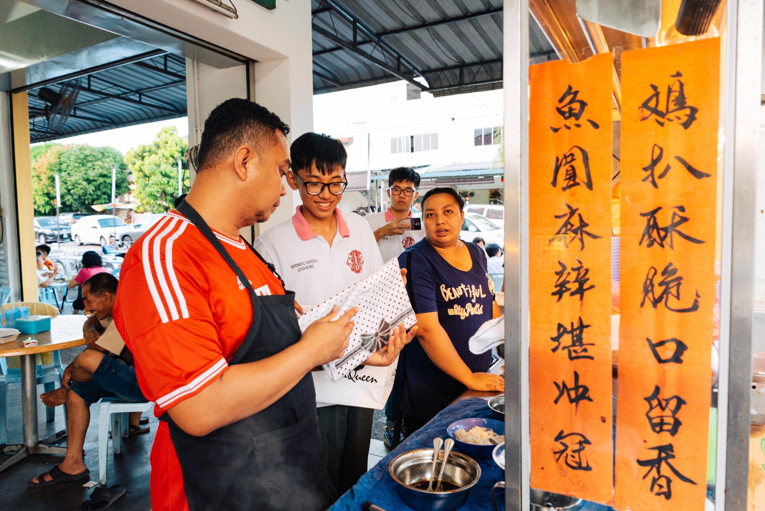 Die LEOs von Batu Pahat machen auf eine umweltschonendere Alternative zu Styropor-Verpackungen bei den Straßenverkäufern aufmerksam und schenken ihnen kompostierbare Taschen.