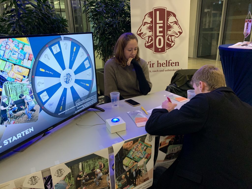Mit einem einfachen Glücksrad konnten die Studentinnen mit den LEOs ins Gespräch kommen. Gewinnt man, gab’s ein Freibier, gewinnt man nichts, musste der Teilnehmer, bzw. die Teilnehmerin eine Frage ziehen und diese beantworten. Fragen waren z.B. „Was war dein Berufswunsch als Kind?“ oder „Welchen Titel hätte dein Leben wenn es ein Buch wäre?“. So kamen wir spielerisch ins Reden und konnten viele neue Personen kennenlernen – und sie uns.
